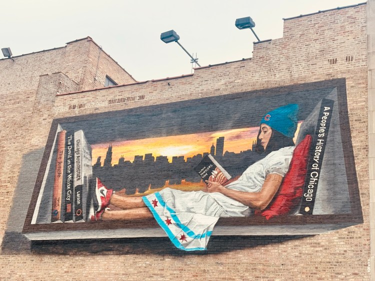 A group of friends, maybe from out of town, maybe from another part of town, linger in the middle of the sidewalk holding iced grandi and hot ventis, their gaze toward the diamond in the skyline discussing if they should walk toward the Magnificent Mile. In the darkened storefront of Kilwins, eighty-nine nut-studded and dark chocolate drizzled caramel apples along with forty-one pretzel sticks to match, are placed neatly on the marble countertop waiting for the shop’s 1:00PM daily opening. Walking north and nearly latching himself to the buildings, a man struts with a walker. Another man leans against the Van Buren Street Station entrance and smokes a cigarette. A third who has a greying stubbly beard, stands at his daily spot, twelve feet over, near the entrance’s elevator. With a large, uncapped Dunkin’ cup in his hand, he offers a jovial greeting to every person who walks past him. A woman with a solid stride, wearing a backpack and sneakers embellished with city grit, reaches in her pocket, drops her daily contribution in his cup, and keeps walking with an undeterred pace. A ballet dancer and violin, unassuming figures constructed from moss and greenery staked snugly against tree trunks growing in stone flower planters in front of the Fine Arts Building, a historic hub for all the arts, endure the seasonal elements. While determining their location on their phones, a couple, her wearing a navy wool beret and chestnut lace up work boots, he a Canon camera with a neck strap as a crossbody, look up and down the sidewalk and up and down the sidewalk again then at the planters. They study these delightful pieces of art with the curiosity of which one dissects an ancient painting or a favored poem. They look behind them at the ten-floor building. They step toward the sidewalk sign advertising the independent bookstore, Exile in Bookville. They peak through the windowed front doors framed with fluted and flower chair molding painted turquoise. They pull the leaf embossed antique brass door handles. They walk inside under the stone threshold etched with the words, “All passes—Art Alone Endures,” and disappear.